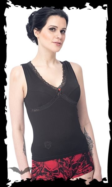 Ein schlichtes Gothic-Top. Mittig zwischen den Brüsten befindet sich eine kleine Verzierung. Ansonsten hat dieses Top Spitze am Saum. Farbe: schwarz Material: 95% Viskose, 5% Elasthan Größe: XS – XXL Maßtabelle: