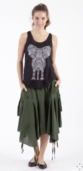 Ein schöner assymmetrischer Rock. Er ist locker geschnitten und hat Seitentaschen. Außerdem sind unten Bänder angebracht. Farbe: oliv, schwarz, rost Größe: One-Size Material: 100% Baumwolle