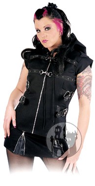 Geniale Weste mit Bondageelementen und Kapuze. Material: 100% Baumwolle Farbe: schwarz Größe: S/M, L/XL Maße XS S M L XL XXL XXXL Damen 34 36/38 38/40 40/42 42/44 44/46 48