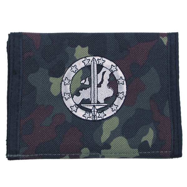 Praktische Geldbörse mit Geldschein- und Münzfach, zwei Ausweishüllen, einem Einschubfach sowie praktischen Klettverschluss. Ausführung: Eurocorps Farbe: flecktarn Material: 100 % Polyester