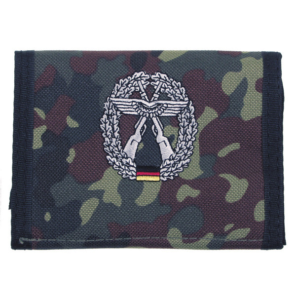 Praktische Geldbörse mit Geldschein- und Münzfach, zwei Ausweishüllen, einem Einschubfach sowie praktischen Klettverschluss. Ausführung: LW Sicherungstrupp Farbe: flecktarn Material: 100 % Polyester