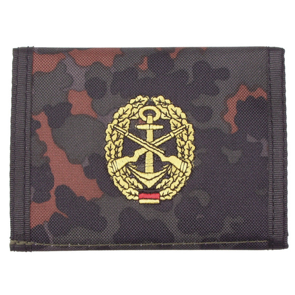 Praktische Geldbörse mit Geldschein- und Münzfach, zwei Ausweishüllen, einem Einschubfach sowie praktischen Klettverschluss. Ausführung: Marienesicherungsdienst Farbe: flecktarn Material: 100 % Polyester