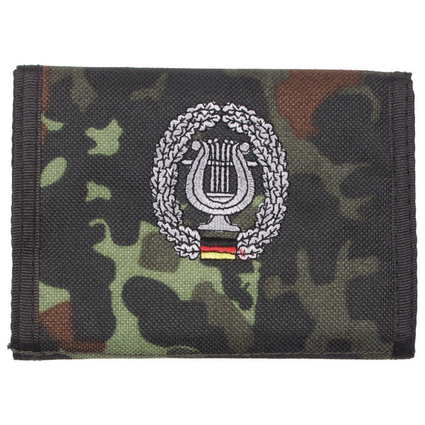 Praktische Geldbörse mit Geldschein- und Münzfach, zwei Ausweishüllen, einem Einschubfach sowie praktischen Klettverschluss. Ausführung: Musikkorps Farbe: flecktarn Material: 100 % Polyester