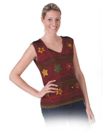 Damen Top ohne Ärmel. Es ist mit einem schönen Muster mit Blumen verziert. Farbe: rot oliv, beige Größe: One Size Material: 100% Baumwolle