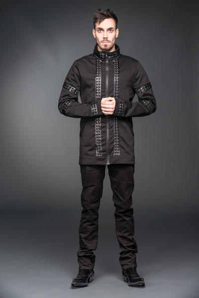 Leichte Jacke für Männer mit schwarzen Lederimmitat-Applikationen und zahlreichen, auffälligen Nieten-Details. Besteht aus Baumwolle und peppt jeden Kleiderschrank auf! Material: 100 % Baumwolle Größe: S bis 2XL Farbe: schwarz