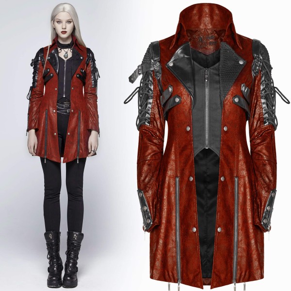Diese rote Steampunk-Mantel aus Kunstleder reicht bis über das Gesäß und ist aufwändig mit vielen Details verarbeitet. An den Oberarmen befinden sich eine Schnürung sowie mehrere schwarze Schnallen und Riemen. Auch an den Seiten sind schwarze Kunstlederriemen angebracht, die schräg über…