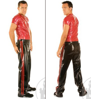 Jogginghose aus hochwertigem Latex, sie ist in schwarz mit roten Streifen und blau mit weißen Streifen erhältlich sowie in den größen S bis XL. Material: 100% Naturlatex Farbe: schwarz-rot und blau-weiß Größen: S, M, L und XL Maßtabelle :