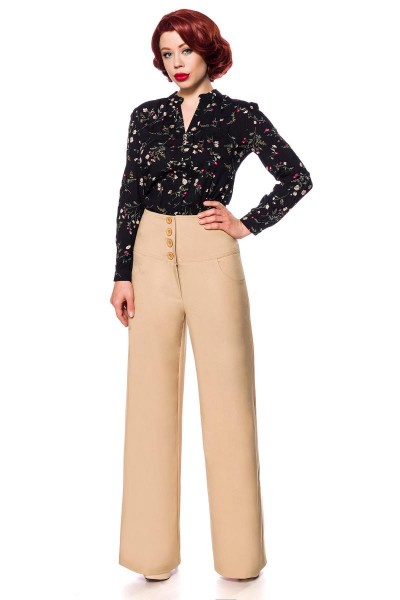 Hierbei handelt es sich um eine schöne Marlenehose mit hohem Bund und Eingriffstaschen im Vorderteil. Die Hose hat Knöpfe und einen Reißverschluss und ist aus elastischem Material. Größe: S, M, L, XL, XXL (+6,00€ Aufpreis), XXXL (+6,00€ Aufpreis) Farbe: schwarz, grau, beige Material: 100% Polyester Maßtabelle:
