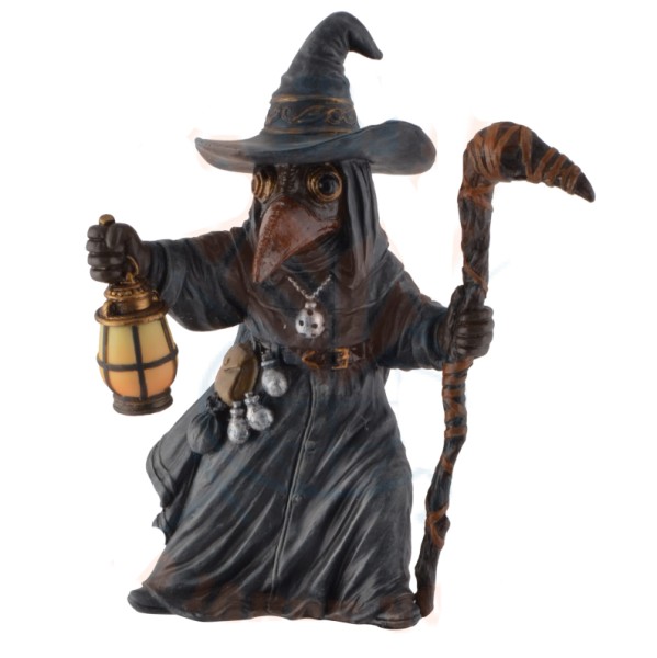 Statue eines Pestdoktors mit einer Lampe in der rechten und einem langen Gehstock in der linken Hand. Mit vielen liebevollen Details. Maße: ca. 12 x 7 x 14 cm