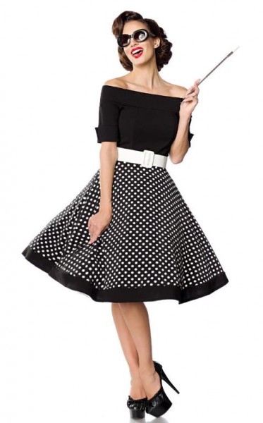 Dieses schulterfreie Retrokleid mit Tellerrock hat kurze Ärmel mit Manschetten. Auf Taillenhöhe befindet sich eine Teilungsnaht. In der Mitte des Kleids befindet sich ein nahtfeiner Reißverschluss. Ein Jersey-Gürtel mit Dornschnalle ist inklusive. Das Oberteil ist aus elastischem Material….