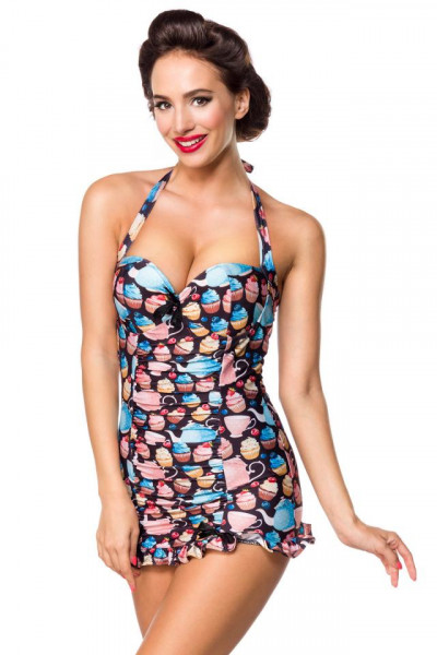 Der Vintage Badeanzug verfügt über Neckholder zum Binden, wattierte Cups, Raffung am Vorderteil sowie Rüschen am Saumabschluss. Der Badeanzug ist in drei Farbvarianten erhältlich: in Schwarz/Pink mit Kuchen Applikationen, in Blau/Helles Pink mit Blumenapplikationen und in…