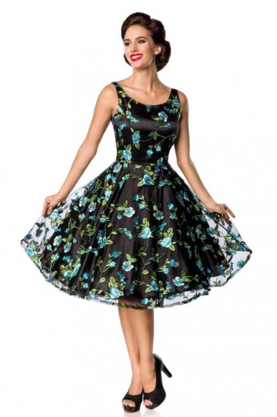 Dieses gefütterte Vintagekleid hat ein weit ausgestelltes, mehrlagiges Rockteil. Der Oberstoff ist aus Netz mit aufgesticktem Blumenmuster. In der hinteren Mitte befindet sich ein nahtfeiner Reißverschluss. Die…
