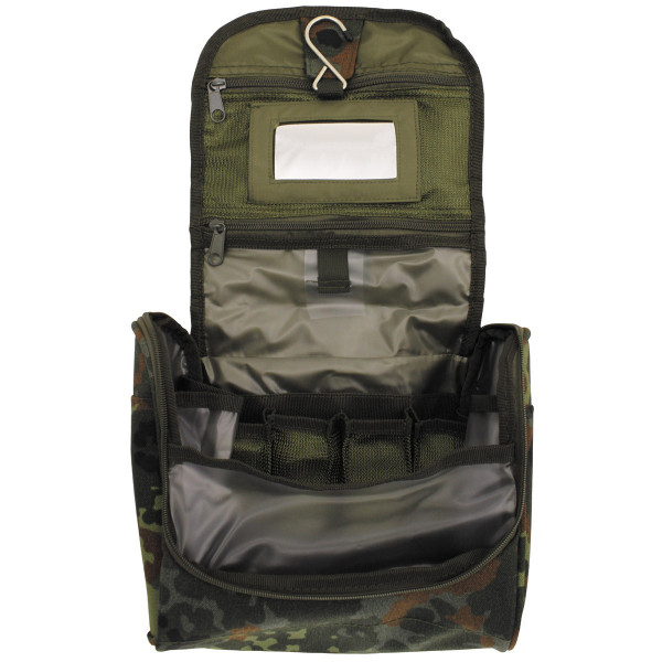 Waschzeugtasche mit vier Einschubtaschen innen aus Mesh, zwei seitlichen Einschubtaschen innen aus Plastik, Innenfach komplett aus waschbarem Plastik, Deckeltasche innen mit zwei Reißverschluss-Taschen, herausnehmbarer Kunststoffspiegel, Aufhängehaken, Deckel mit Reißverschluss-Tasche aussen…